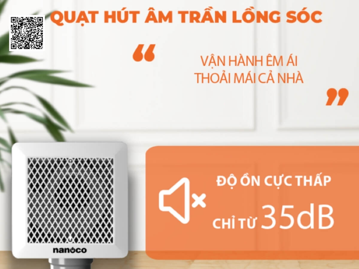Quạt hút âm trần Nanoco NFV2021 hoạt động với công suất 12.5W nhưng vẫn tạo ra lưu lượng gió 145 m³/giờ, giúp loại bỏ mùi hôi, hơi ẩm và khí độc hiệu quả chỉ trong thời gian ngắn. Với độ ồn 38 – 45 dBA, quạt vận hành êm ái, không gây khó chịu cho sinh hoạt hàng ngày. Đây là giải pháp tiết kiệm điện năng tối ưu, phù hợp cho các gia đình hoặc văn phòng nhỏ.