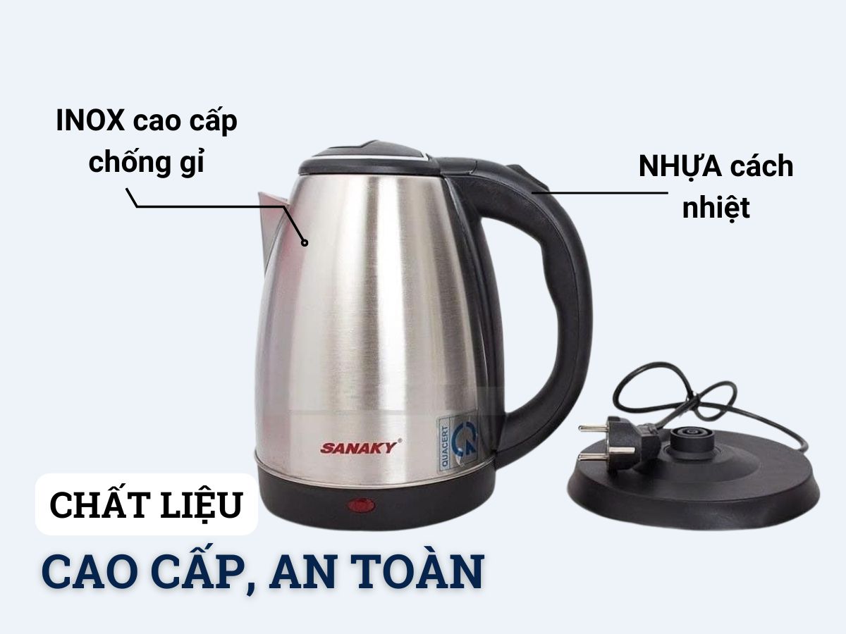 Ấm đun nước siêu tốc Sanaky SNK 18NS có phần thân ấm được làm từ inox chống gỉ, không sản sinh ra chất độc hại khi đun nấu ở nhiệt độ cao, đảm bảo an toàn cho sức khoẻ.