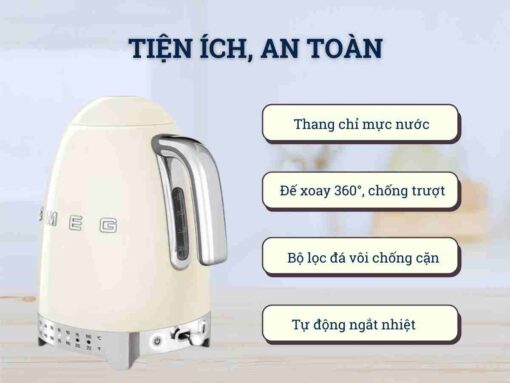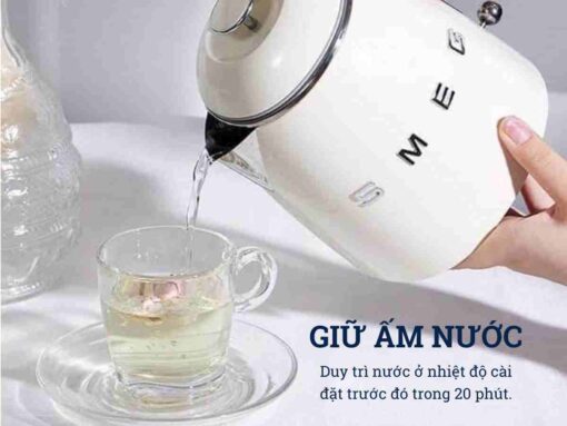 Smeg KLF04CREU còn có chức năng giữ ấm nước giúp bạn có được nước nóng để sử dụng mà không cần phải đun nhiều lần, tiết kiệm thời gian. Chức năng cho phép duy trì nước ở nhiệt độ đã cài đặt trước đó trong vòng 20 phút.
