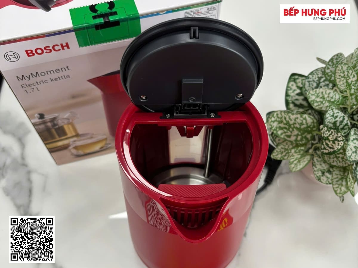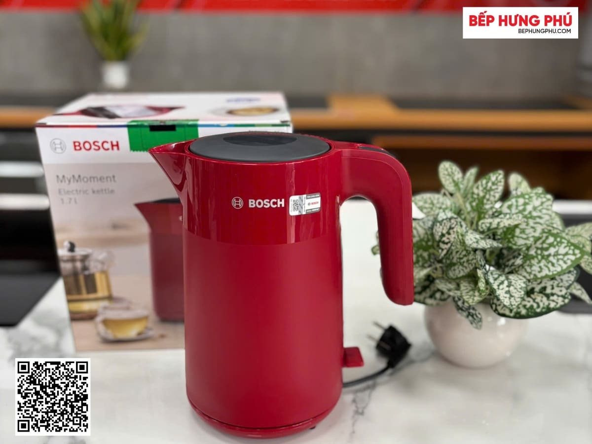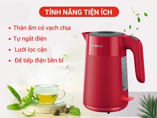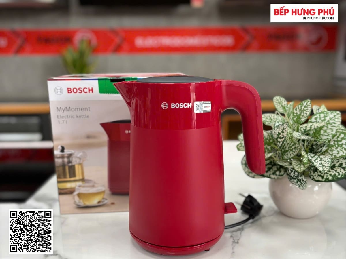 Ấm siêu tốc Bosch TWK2M164 thiết kế hiện đại, sang trọng với gam màu đỏ nổi bật, chất liệu nhựa cao cấp khả năng chịu nhiệt tốt, cách điện, cách nhiệt an toàn. Công suất 2400W giúp đun sôi nước nhanh chóng, dung tích 1.7 lít phù hợp với nhiều gia đình.