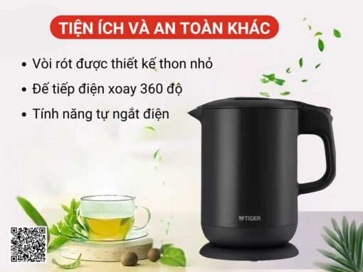 Ấm siêu tốc Tiger PCG-G10(HU) với dung tích 1 lít và công suất 1300W giúp đun sôi nước nhanh chóng chỉ trong 5-7 phút, tiện lợi để pha trà, cà phê, mì gói, pha sữa… Ruột ấm chất liệu inox 304 phủ fluoride cao cấp, chống gỉ và an toàn sức khoẻ. Vỏ ấm bằng nhựa cách nhiệt an toàn, màu đen dễ phù hợp với mọi không gian bếp. Đặc biệt là thiết kế nút nhấn khóa nước nóng trên nắp bình giúp chống tràn hiệu quả, bảo vệ an toàn khi sử dụng.
