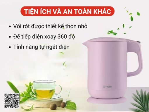 Ấm siêu tốc Tiger PCG-G10(P) với dung tích 1 lít và công suất 1300W giúp đun sôi nước nhanh chóng chỉ trong 5-7 phút, tiện lợi để pha trà, cà phê, mì gói, pha sữa… Ruột ấm chất liệu inox 304 phủ fluoride cao cấp, chống gỉ và an toàn sức khoẻ. Vỏ ấm bằng nhựa cách nhiệt an toàn, màu hồng đẹp mắt, tăng thêm thẩm mỹ cho không gian bếp. Đặc biệt là thiết kế nút nhấn khóa nước nóng trên nắp bình giúp chống tràn hiệu quả, bảo vệ an toàn khi sử dụng.