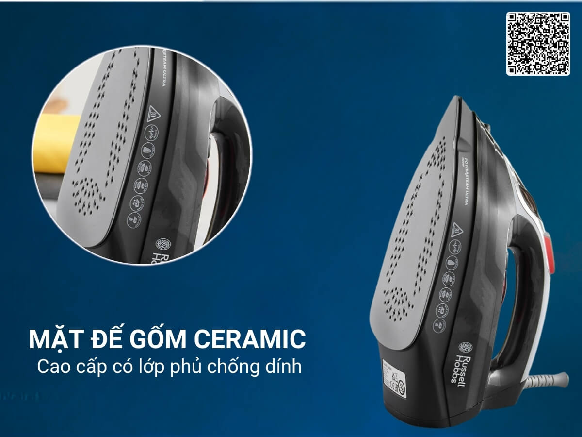 Mặt đế Bàn ủi hơi nước Russell Hobbs Powersteam Ultra 20630-56 bằng gốm Ceramic cao cấp có lớp phủ chống dính, giúp lướt êm ái hơn đến 50% trên mọi chất liệu vải, giảm thiểu ma sát và bảo vệ quần áo khỏi bị cháy xém. Đầu bàn ủi được thiết kế thuôn nhọn cùng rãnh cúc tiện lợi, giúp bạn dễ dàng tiếp cận những khu vực khó ủi nhất như cổ áo, vai áo hay hàng cúc.