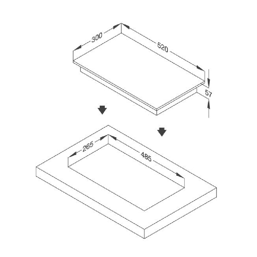 - Kích thước bếp: 300R x 520S x 57C mm