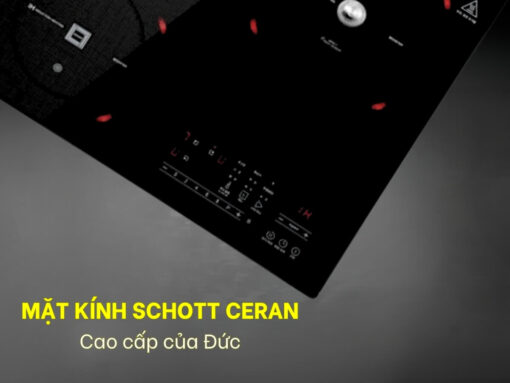 Bên cạnh đó là khả năng chịu lực cao, bạn có thể thoải mái sử dụng nồi nấu trên cả 2 vùng nấu cùng lúc mà không lo trọng lượng lớn từ xoong nồi làm hỏng mặt kính. Mặt kính Schott Ceran trên bếp điện từ này còn được hoàn thiện với độ nhẵn mịn cao, dễ dàng vệ sinh, lau chùi.