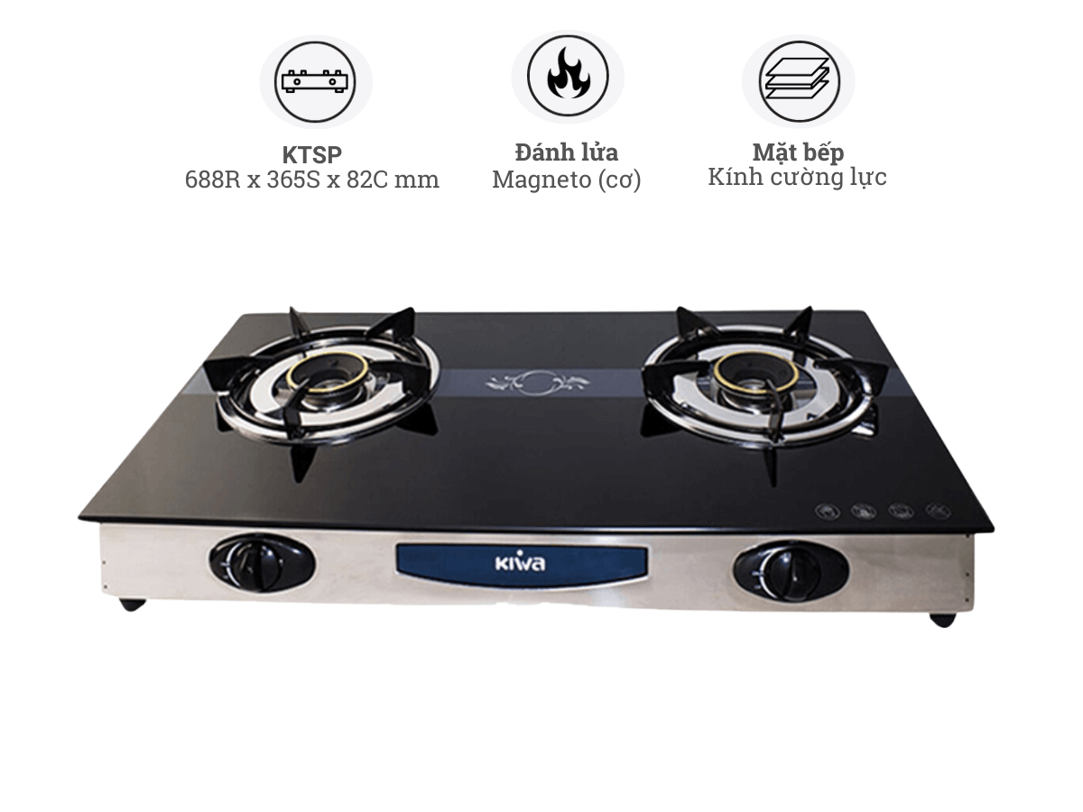 Bếp gas Kiwa KA-2112GBK trang bị mặt kính cường lực an toàn, bền chắc và tăng thêm thẩm mỹ cho căn bếp. Đầu đốt bằng đồng siêu bền và cho hiệu suất đun nấu cao, tiết kiệm gas và không làm đen đáy nồi.