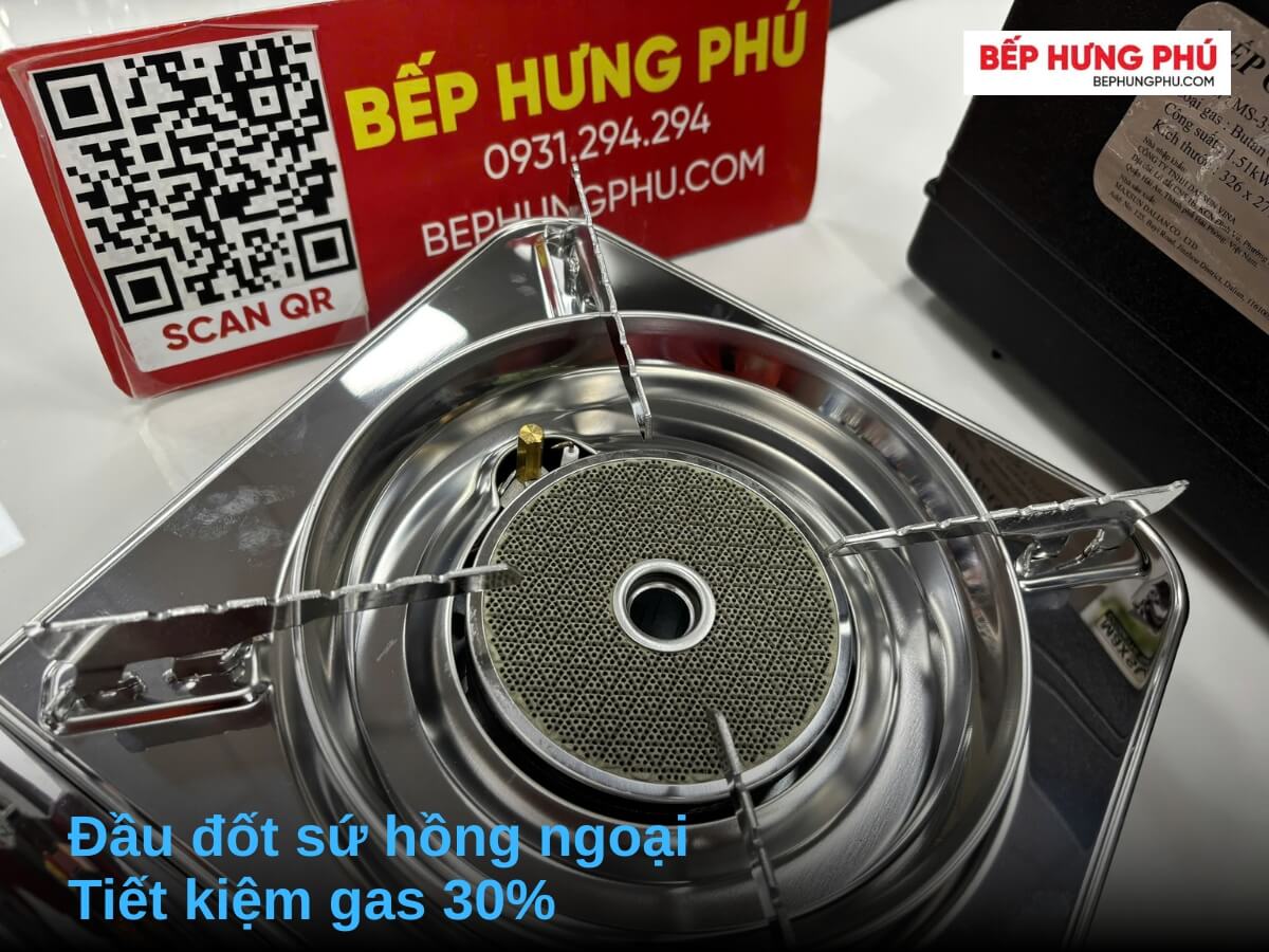 - Đầu đốt sứ hồng ngoại tiết kiệm gas lên đến 30%, đốt cháy hoàn toàn lượng gas tiêu thụ và không bị gió làm tắt bếp.