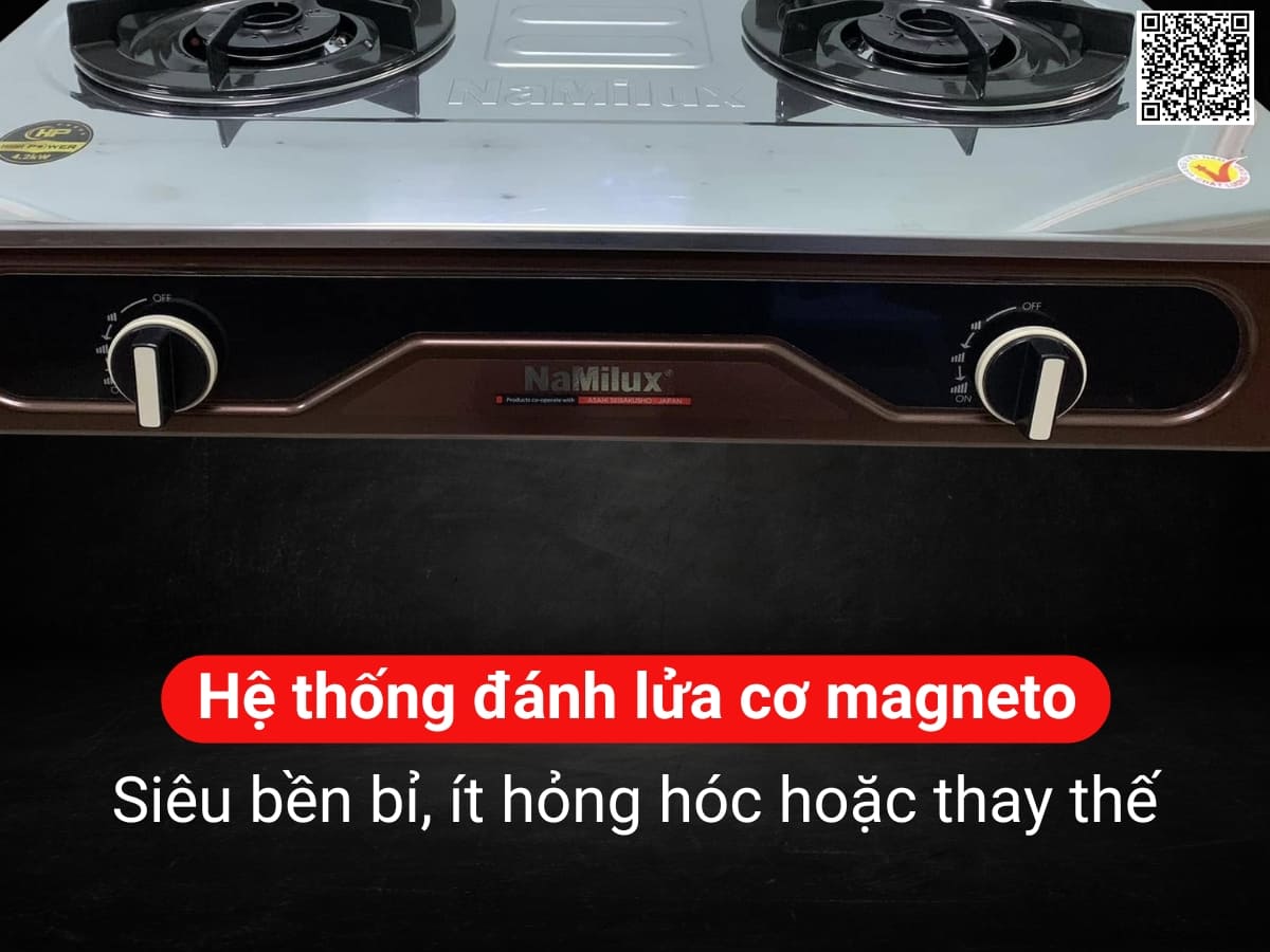 Bếp gas NaMilux DL2063APS trang bị hệ thống đánh lửa cơ Magneto, điều khiển bằng núm vặn linh hoạt, bền bỉ, ít hỏng hóc và không cần thay pin như hệ thống IC. Bạn chỉ cần ấn và xoay vặn nhẹ núm để bật bếp, điều chỉnh ngọn lửa to nhỏ dễ dàng, đáp ứng mọi nhu cầu nấu ăn của gia đình.