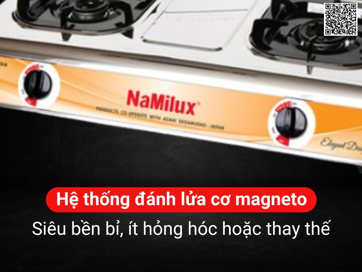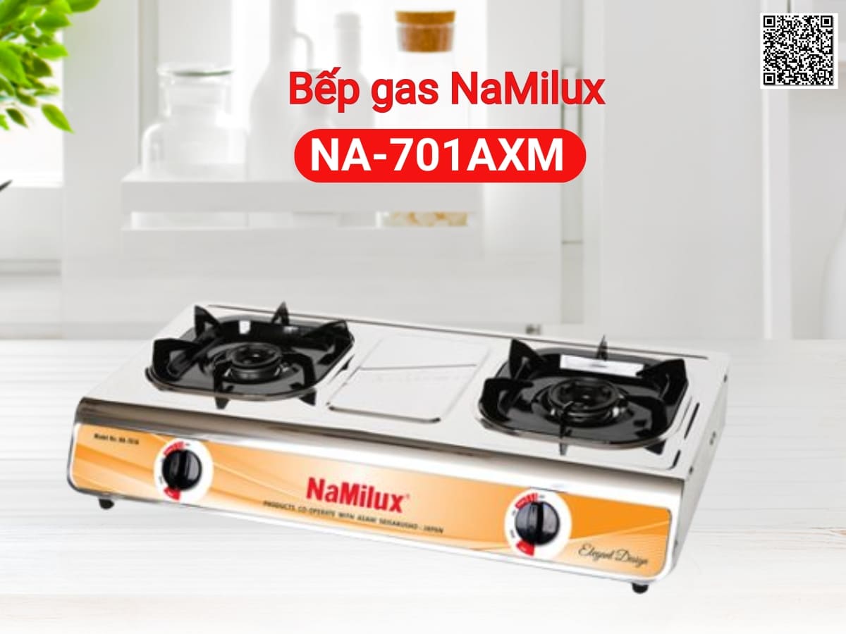 Bếp gas NaMilux NA-701AXM thiết kế bếp dương với kiểu dáng truyền thống, cứng cáp. Mặt bếp bằng inox bền bỉ, chống hoen gỉ, rất khó bám bẩn và dễ dàng vệ sinh. Thiết kế 2 lò nấu đáp ứng tốt nhu cầu nấu nướng hàng ngày của gia đình. Bộ ống điếu đầu đốt bằng hợp kim nhôm cho hiệu suất đốt cao, tạo ngọn lửa xanh. Ống điếu bằng inox chịu nhiệt tốt, chống biến dạng khi nấu ở nhiệt độ cao và cho tốc độ bắt lửa nhanh.
