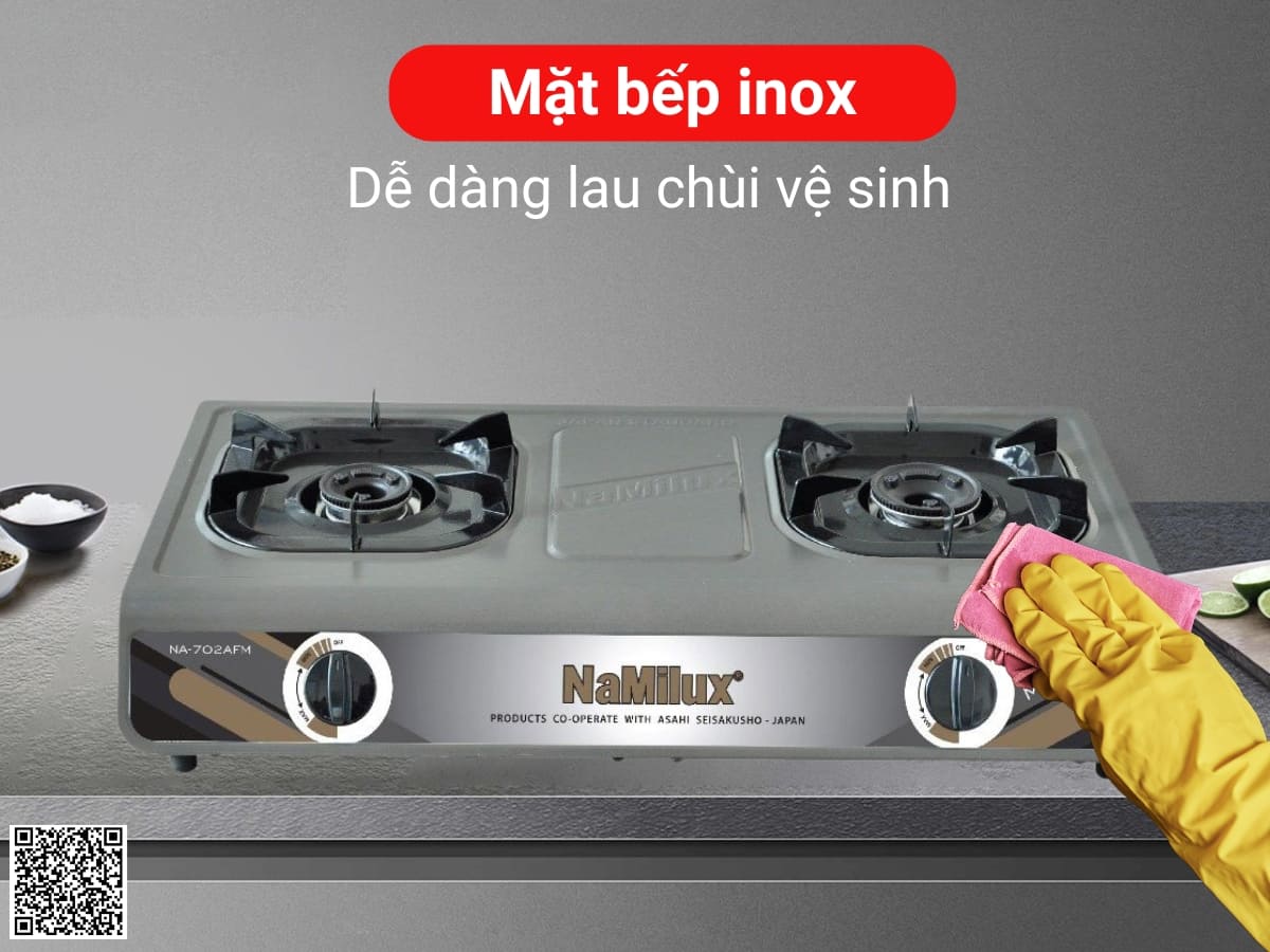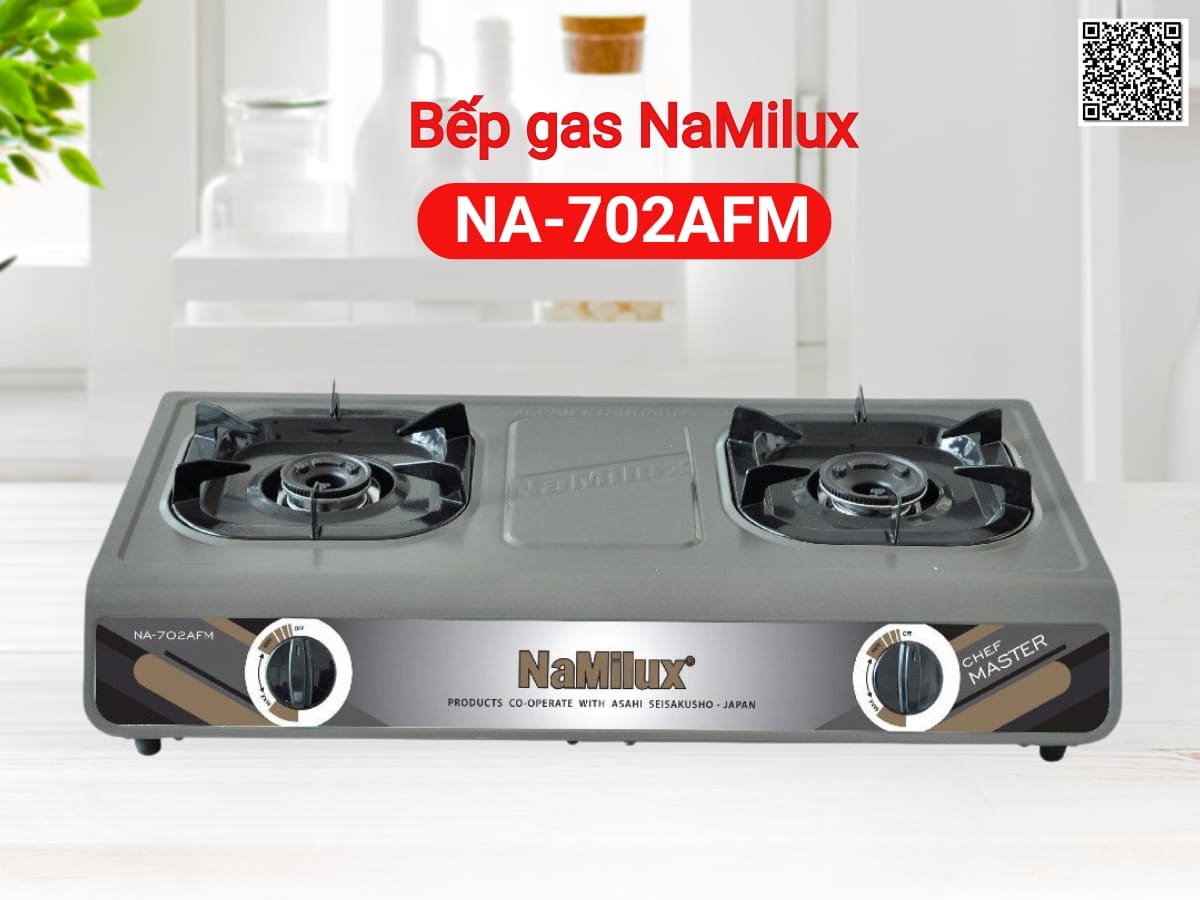 Bếp gas NaMilux NA-702AFM thiết kế bếp dương với kiểu dáng truyền thống, cứng cáp. Mặt bếp bằng inox bền bỉ, chống hoen gỉ, rất khó bám bẩn và dễ dàng vệ sinh. Thiết kế 2 lò nấu đáp ứng tốt nhu cầu nấu nướng hàng ngày của gia đình. Bộ ống điếu đầu đốt bằng hợp kim nhôm cho hiệu suất đốt cao, tạo ngọn lửa xanh. Ống điếu bằng inox chịu nhiệt tốt, chống biến dạng khi nấu ở nhiệt độ cao và cho tốc độ bắt lửa nhanh.