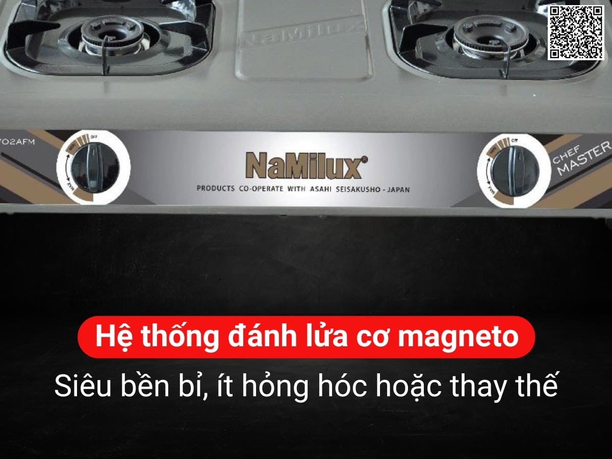 Bếp gas NaMilux NA-702AFM trang bị hệ thống đánh lửa cơ học Magneto, đảm bảo lửa nhạy cháy, ổn định và độ bền cao. Bạn chỉ cần ấn và xoay vặn nhẹ núm để bật bếp, điều chỉnh ngọn lửa to nhỏ dễ dàng. Núm vặn làm bằng nhựa ABS nguyên sinh được bố trí mặt trước của bếp, giúp dễ dàng điều chỉnh nhiệt độ trong lúc nấu, đáp ứng mọi nhu cầu nấu ăn của gia đình.