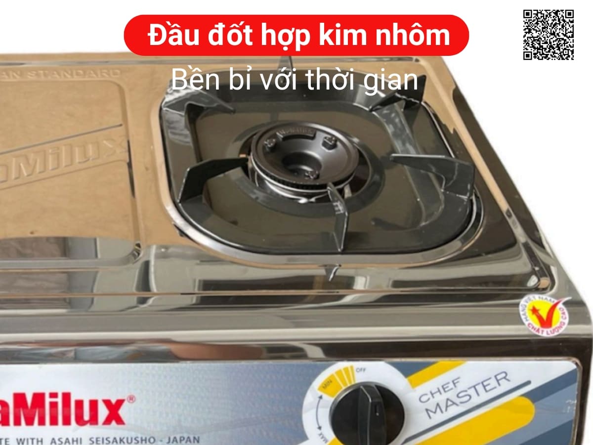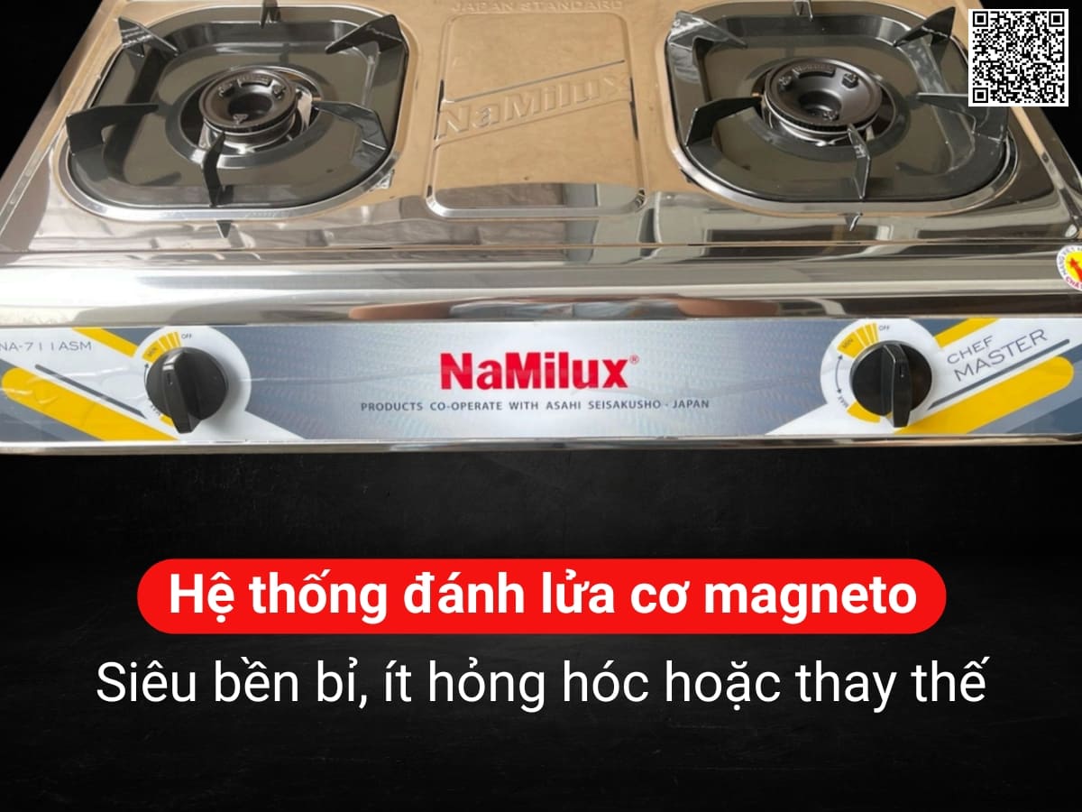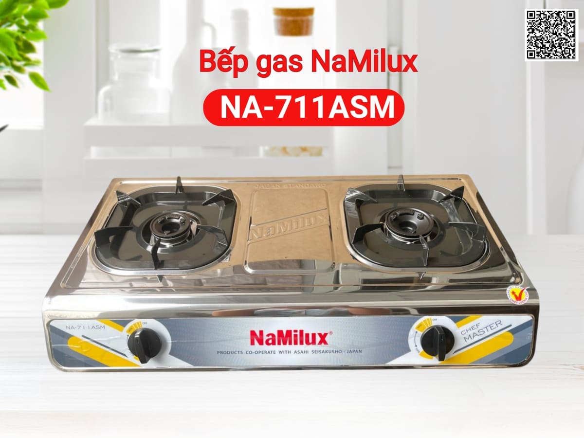 Bếp gas NaMilux NA-711ASM thiết kế bếp dương với kiểu dáng truyền thống, cứng cáp. Mặt bếp bằng inox bền bỉ, chống hoen gỉ, rất khó bám bẩn và dễ dàng vệ sinh. Thiết kế 2 lò nấu đáp ứng tốt nhu cầu nấu nướng hàng ngày của gia đình. Bộ ống điếu đầu đốt bằng hợp kim nhôm cho hiệu suất đốt cao, tạo ngọn lửa xanh. Ống điếu bằng inox chịu nhiệt tốt, chống biến dạng khi nấu ở nhiệt độ cao và cho tốc độ bắt lửa nhanh.