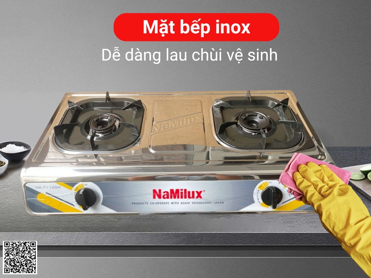 Bếp gas NaMilux NA-711ASM sử dụng mặt bếp hoàn toàn bằng inox sáng bóng, chống hoen gỉ và rất khó bám bẩn. Với chất liệu inox, bếp có khả năng chịu lực, chịu nhiệt tốt, không bị biến dạng. Thiết kế nguyên khối giúp việc vệ sinh, lau chùi bếp cũng dễ dàng và hiệu quả hơn, chỉ cần lau nhẹ là bếp lại sáng bóng như mới.