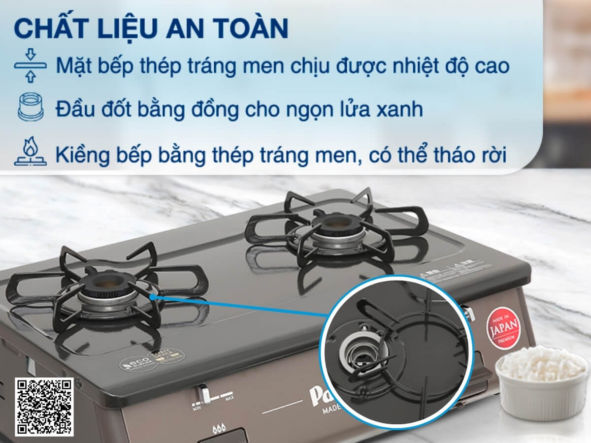 Bếp gas Paloma PA-J61PE (BR) là bếp đôi nhập khẩu từ Nhật Bản với thiết kế để bàn sang trọng, mặt bếp kim loại tráng men bền đẹp, dễ vệ sinh. Đầu đốt Eco 600 bằng đồng tiết kiệm gas, hệ thống đánh lửa IC nhạy bén, cùng cảm ứng ngắt gas tự động và khóa trẻ em đảm bảo an toàn tối đa. Kiềng bếp 6 chân chắc chắn giúp nồi, chảo ổn định, hỗ trợ nấu ăn nhanh, đều và tiện lợi cho mọi gia đình.