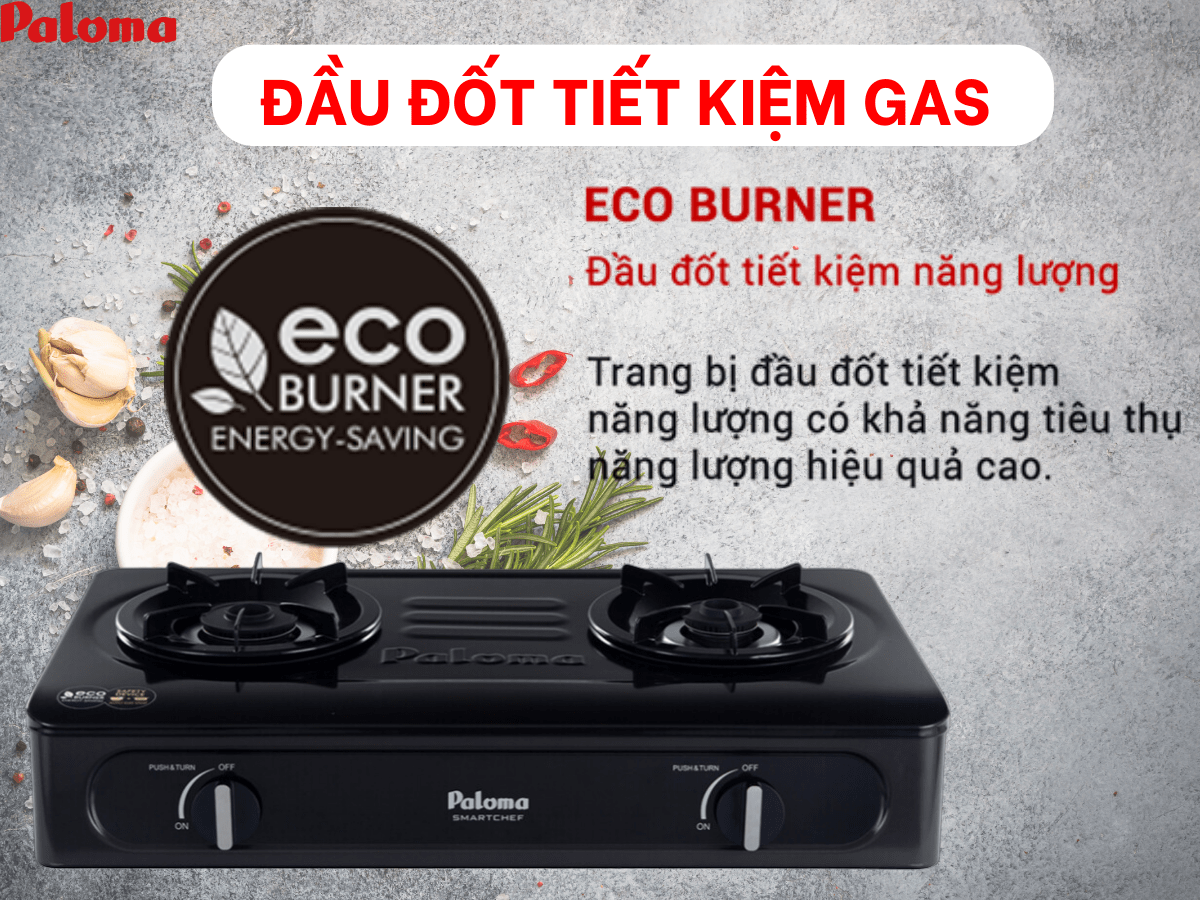 Bếp gas Paloma PA-V71EB sử dụng loại đầu đốt Eco 600 bằng đồng siêu bền. Thiết kế các rãnh nhỏ xung quanh đầu đốt giúp nhiệt lượng được phân bổ đều khắp đáy nồi, giúp món ăn nhanh chín và đặc biệt là tạo ngọn lửa xanh không làm đen đáy nồi. Đầu đốt này có thể tiết kiệm đến 10% lượng gas tiêu thụ và 20% thời gian nấu nướng, giúp người dùng tiết kiệm được nhiều chi phí nhiên liệu cũng như thời gian cho việc bếp núc.