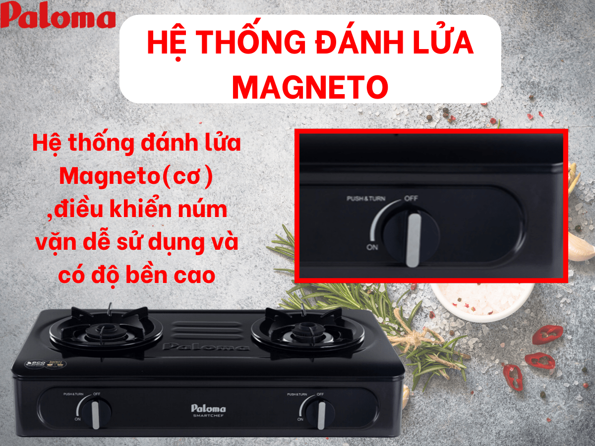 Bếp gas Paloma PA-V71EB sử dụng hệ thống đánh lửa cơ Magneto có ưu điểm là cực bền, đồng thời dễ sử dụng và tạo tia lửa nhanh. Chỉ cần một thao tác ấn xoay núm vặn nhẹ nhàng là tia lửa đã được bật thành công, thao tác sử dụng bếp rất nhanh chóng và dễ dàng.