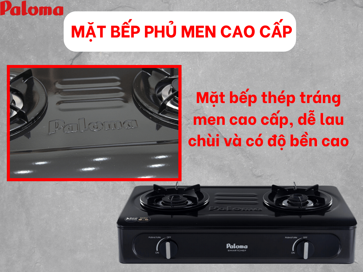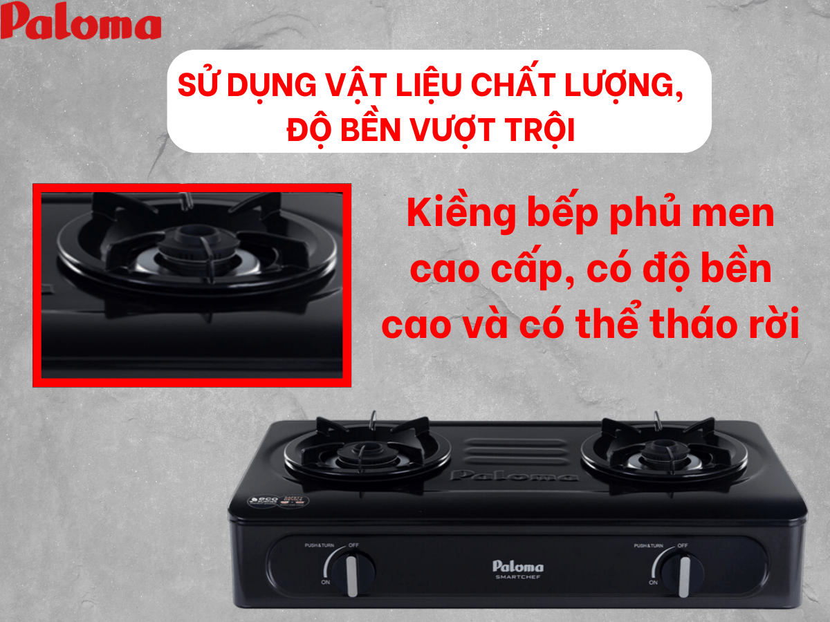 Bếp gas Paloma PA-V71EB có phần mặt bếp được làm từ vật liệu thép chất lượng cao, với khả năng chịu nhiệt và chịu lực đáng nể. Với vật liệu này, mặt bếp có thể chịu được nhiệt độ cao khi nấu nướng và chịu được trọng lượng lớn từ nồi nấu và món ăn, đảm bảo yêu cầu sử dụng hàng ngày với độ bền bỉ đáng tin cậy.