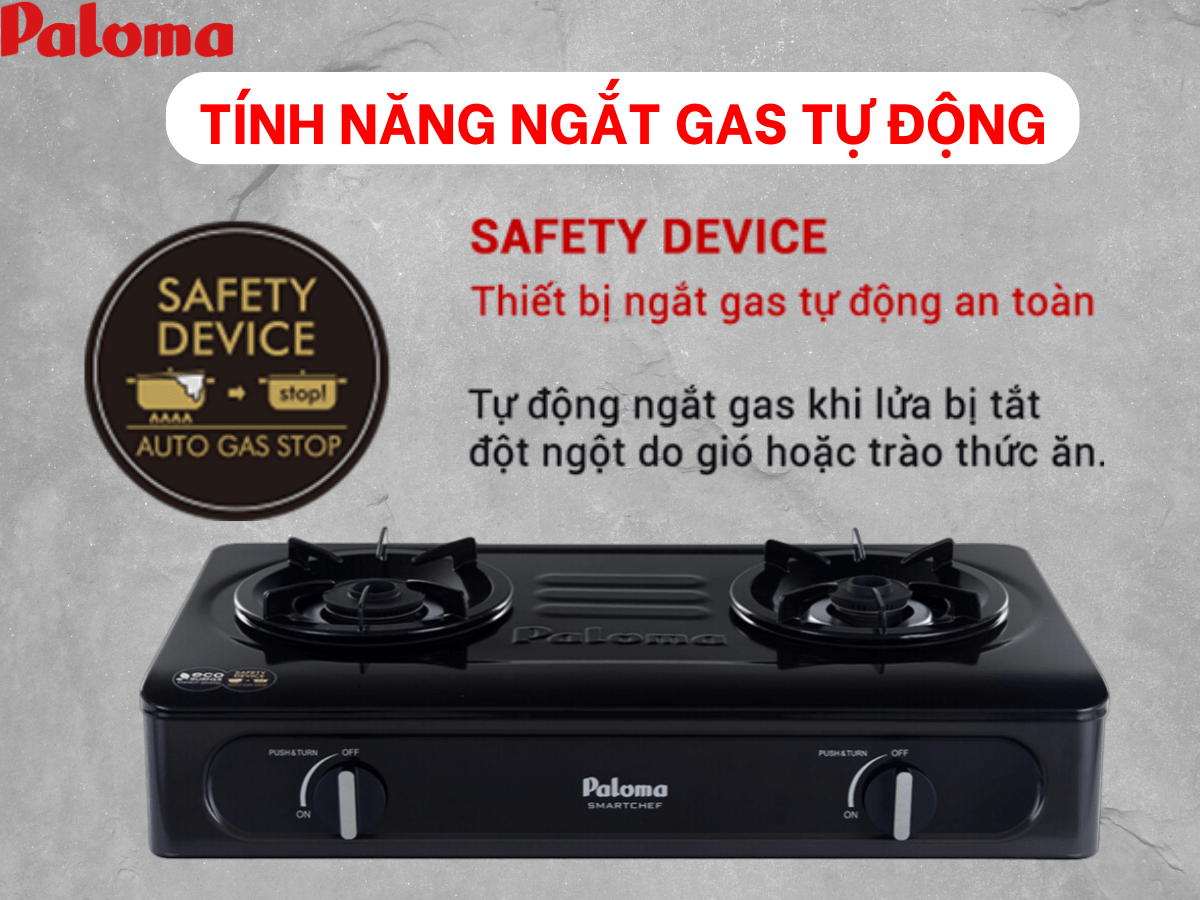 Bếp gas Paloma PA-V71EB được trang bị hệ thống ngắt gas tự động thông minh, đem đến sự an toàn tối đa cho người dùng trong quá trình sử dụng bếp gas. Khi phát hiện có các sự cố lửa tắt đột ngột do gió thổi mạnh hay nước tràn, cảm biến ngắt gas tự động sẽ kích hoạt, ngay lập tức ngắt gas để ngăn ngừa rò rỉ khí gas gây nguy hiểm.