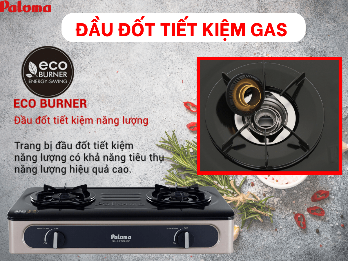 Bếp gas Paloma PA-V71EG sử dụng loại đầu đốt Eco 600 bằng đồng siêu bền. Thiết kế các rãnh nhỏ xung quanh đầu đốt giúp nhiệt lượng được phân bổ đều khắp đáy nồi, giúp món ăn nhanh chín và đặc biệt là tạo ngọn lửa xanh không làm đen đáy nồi. Đầu đốt này có thể tiết kiệm đến 10% lượng gas tiêu thụ và 20% thời gian nấu nướng, giúp người dùng tiết kiệm được nhiều chi phí nhiên liệu cũng như thời gian cho việc bếp núc.