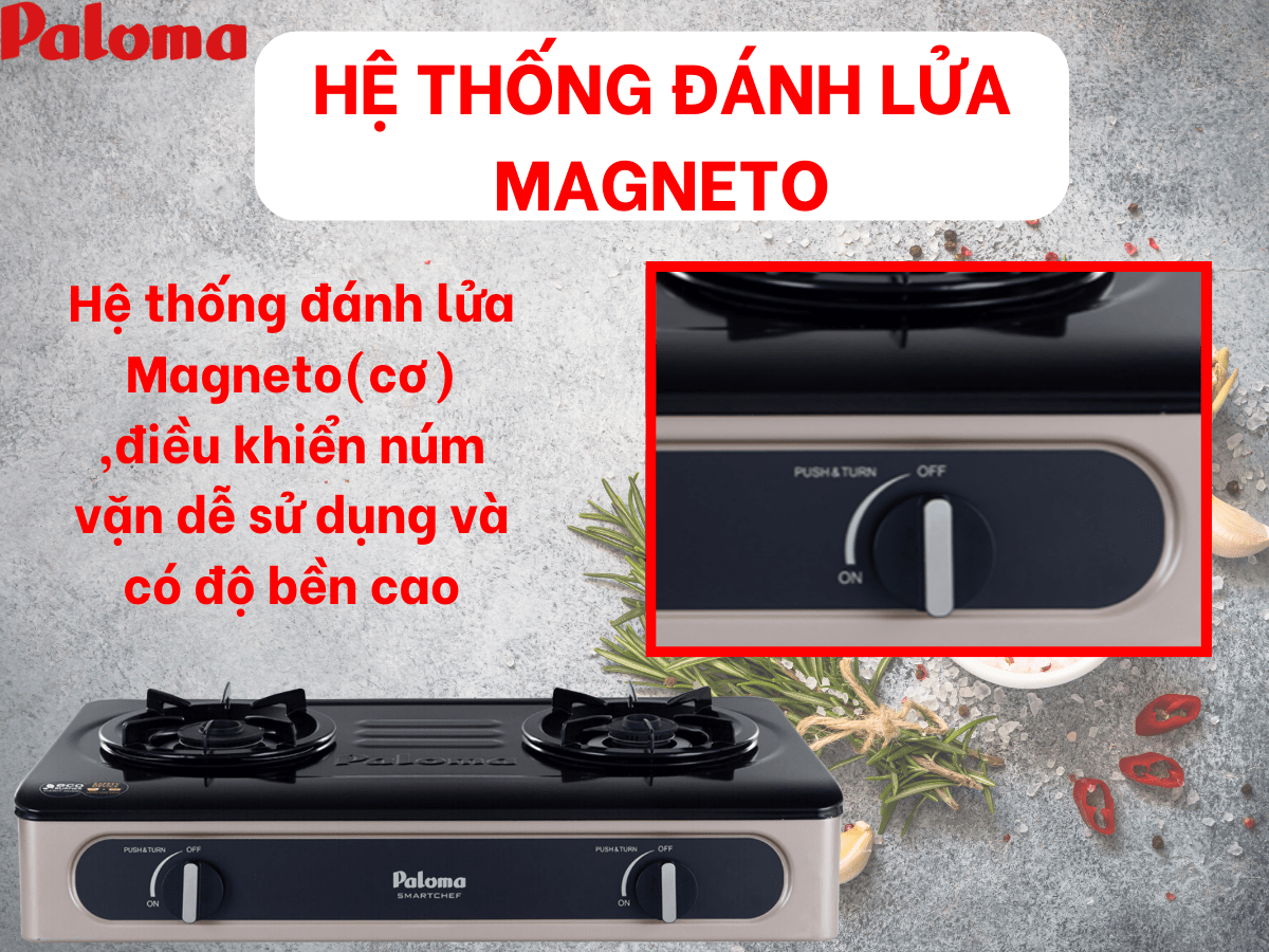 Bếp gas Paloma PA-V71EG sử dụng hệ thống đánh lửa cơ Magneto có ưu điểm là cực bền, đồng thời dễ sử dụng và tạo tia lửa nhanh. Chỉ cần một thao tác ấn xoay núm vặn nhẹ nhàng là tia lửa đã được bật thành công, thao tác sử dụng bếp rất nhanh chóng và dễ dàng.