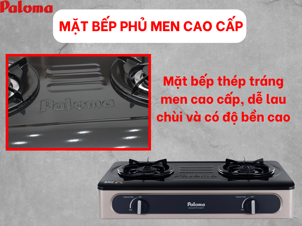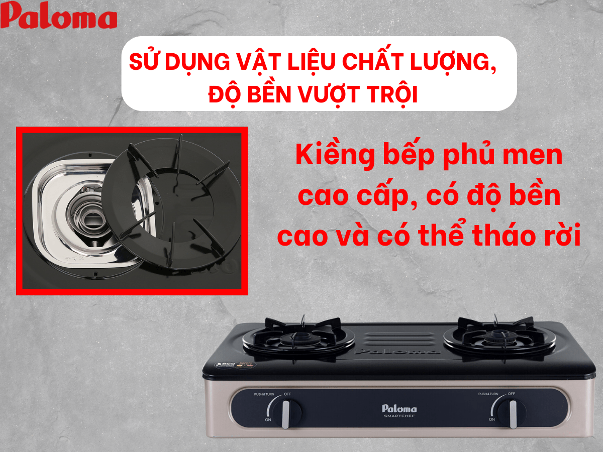 Bếp gas Paloma PA-V71EG có phần mặt bếp được làm từ vật liệu thép chất lượng cao, với khả năng chịu nhiệt và chịu lực đáng nể. Với vật liệu này, mặt bếp có thể chịu được nhiệt độ cao khi nấu nướng và chịu được trọng lượng lớn từ nồi nấu và món ăn, đảm bảo yêu cầu sử dụng hàng ngày với độ bền bỉ đáng tin cậy.