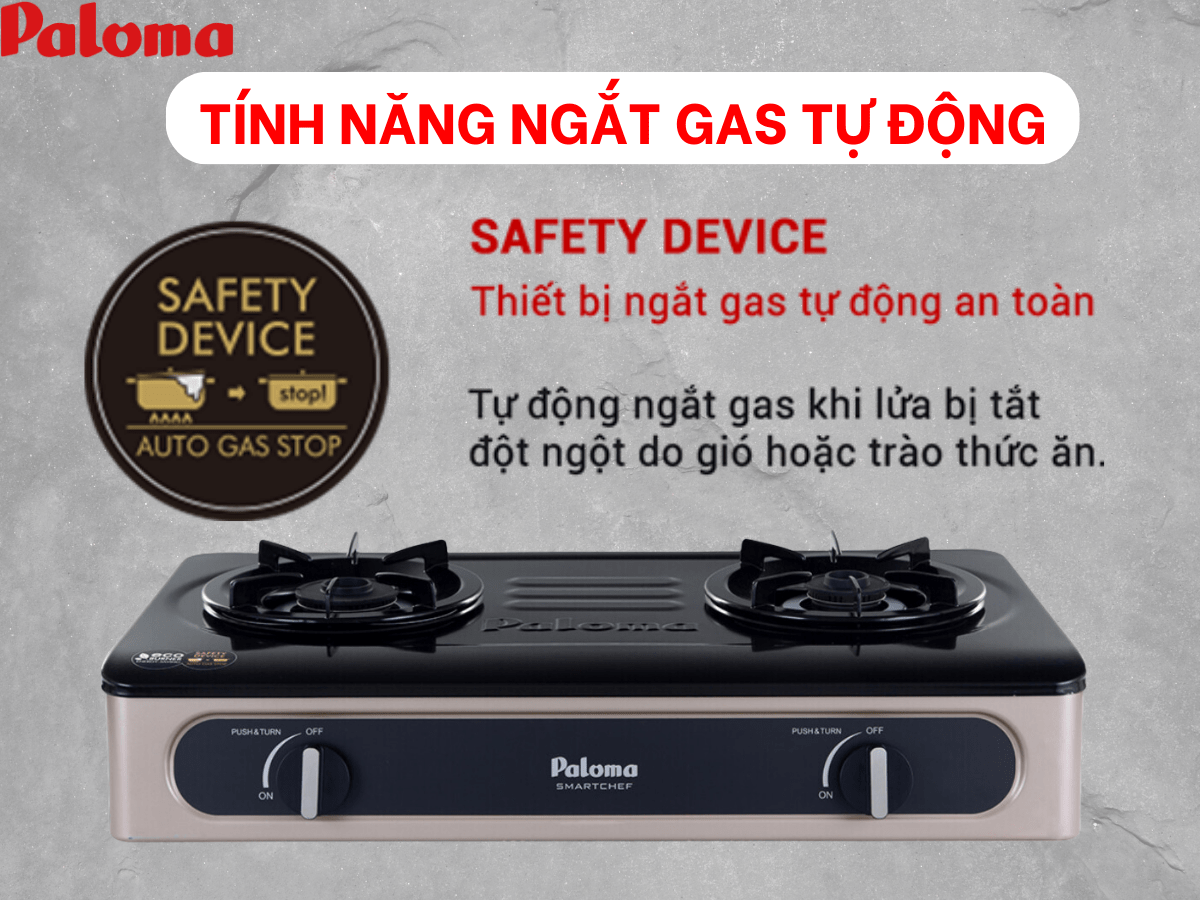 Bếp gas Paloma PA-V71EG được trang bị hệ thống ngắt gas tự động thông minh, đem đến sự an toàn tối đa cho người dùng trong quá trình sử dụng bếp gas. Khi phát hiện có các sự cố lửa tắt đột ngột do gió thổi mạnh hay nước tràn, cảm biến ngắt gas tự động sẽ kích hoạt, ngay lập tức ngắt gas để ngăn ngừa rò rỉ khí gas gây nguy hiểm.