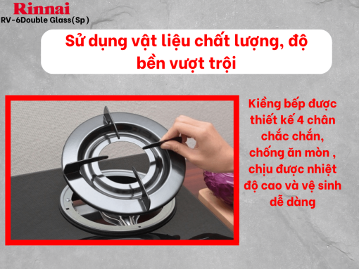 Với bếp gas Rinnai RV-6Double Glass(Sp) thì Rinnai sử dụng khung thép phủ sơn để tạo nên thân bếp, đảm bảo thân bếp cứng cáp, chắc chắn, chịu được trọng lượng cao.