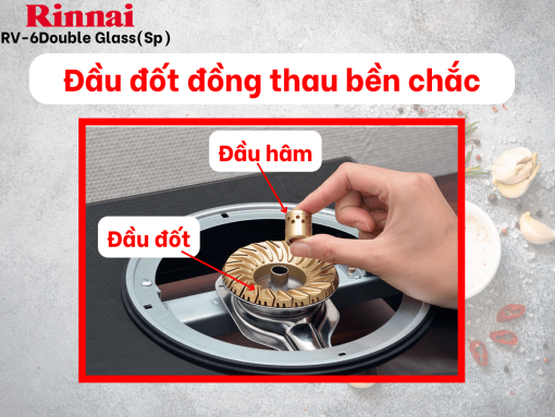 Bếp gas Rinnai RV-6Double Glass(Sp) sử dụng đầu đốt bằng đồng thau bền chắc, không bị ảnh hưởng bởi nhiệt độ cao khi nấu nướng. Đặc biệt, thiết kế đầu đốt với các rãnh xoáy tạo hình ngọn lửa xoắn, tập trung vào vị trí trung tâm, nhiệt lượng được khuếch tán cực đại, giúp nấu chín thực phẩm nhanh chóng với lượng tiêu thụ gas rất tiết kiệm.