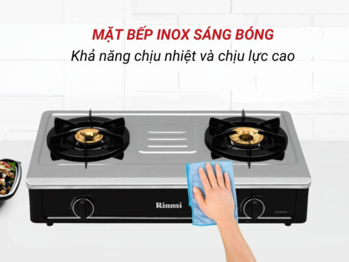 Mặt bếp của bếp gas Rinnai RV-B274S được làm từ inox bền chắc, khả năng chịu nhiệt và chịu lực cao, cho độ bền bỉ đáng tin cậy. Mặt bếp inox sáng bóng, hạn chế gỉ sét và ăn mòn, đồng thời dễ dàng lau chùi, làm sạch sau khi sử dụng.