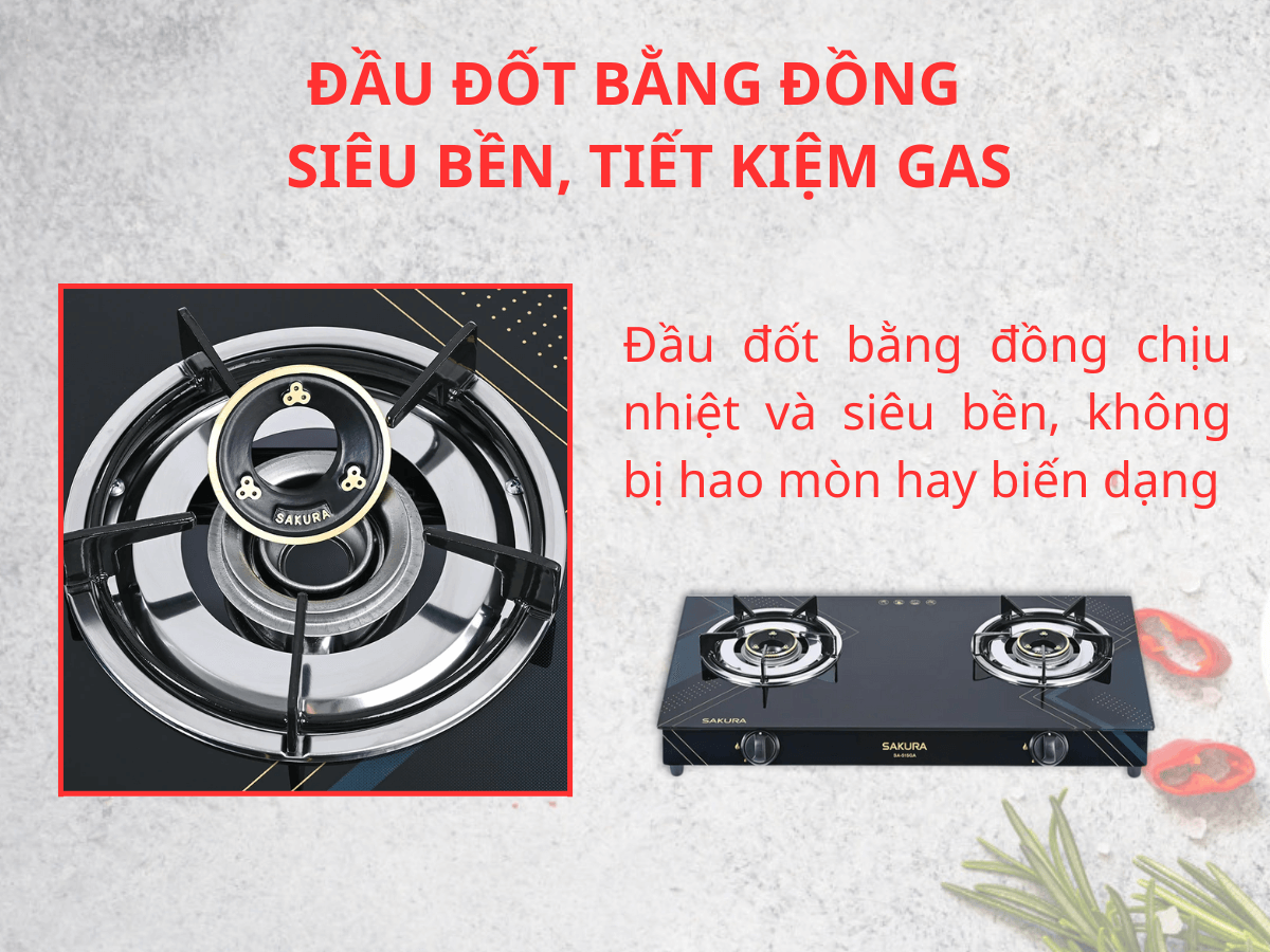 Bếp gas Sakura SA-515GA mang đến cho bạn trải nghiệm nấu nướng đáng tin cậy và tiết kiệm. Với đầu đốt làm từ đồng  đảm bảo sự bền chắc và ổn định trong quá trình sử dụng. Thiết kế đầu đốt tạo ngọn lửa xanh cháy đều, giúp nấu chín thực phẩm nhanh chóng và tiết kiệm gas.