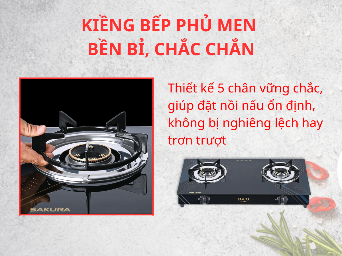 Bếp gas Sakura SA-515GA được trang bị kiềng bếp bằng chất liệu hợp kim phủ men với độ bền cao. Kiềng bếp chắc chắn, không chỉ chống biến dạng và hao mòn dưới tác động của nhiệt độ cao. Cùng với lớp men phủ bên ngoài giúp hạn chế hoen gỉ và dễ chùi rửa hơn.