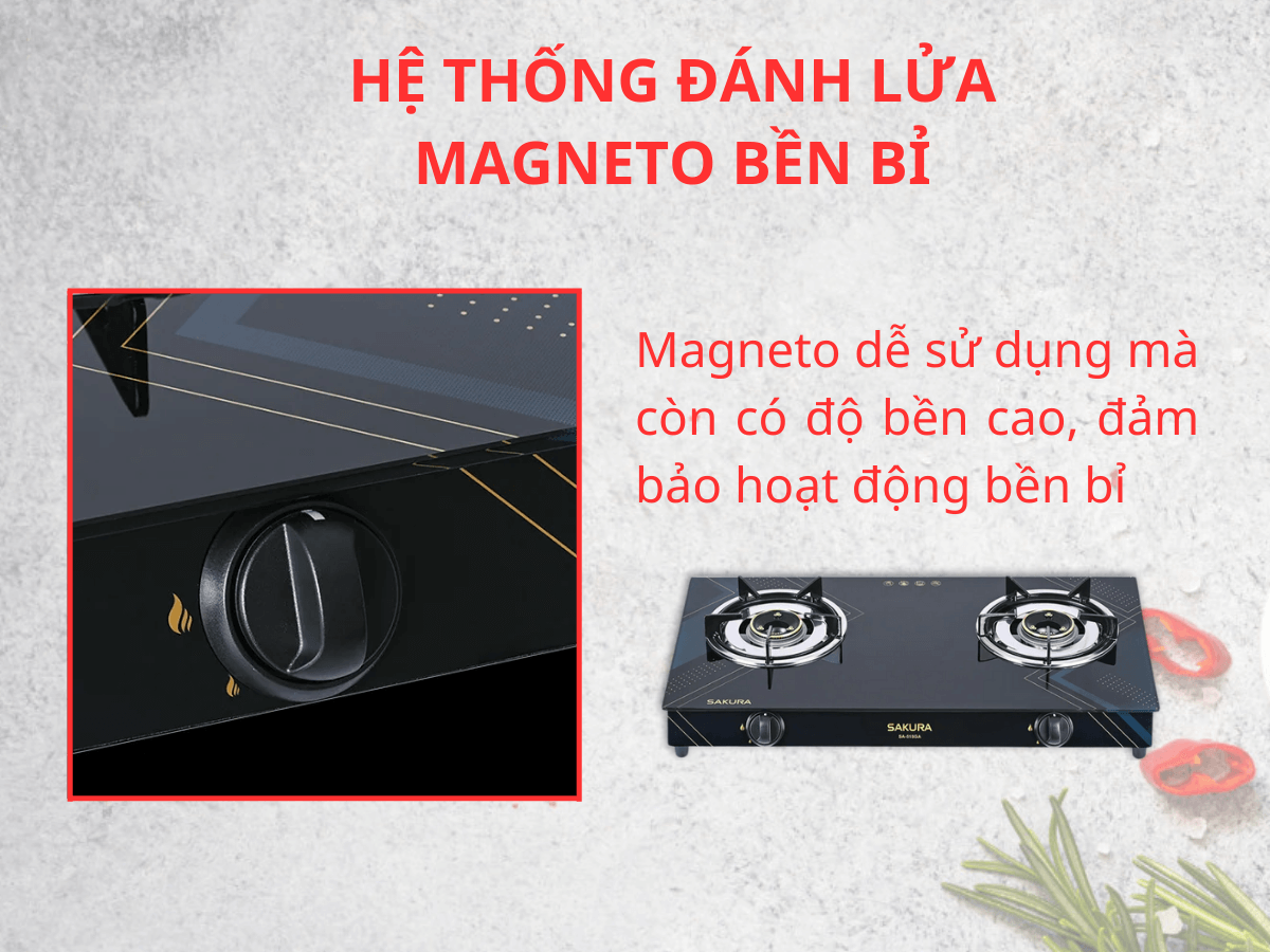Hệ thống đánh lửa cơ Magneto trên bếp gas Sakura SA-515GA cung cấp giải pháp đơn giản và đáng tin cậy cho việc kích hoạt ngọn lửa. Với cơ chế đánh lửa cơ học, bạn chỉ cần nhấn và xoay núm vặn, tia lửa sẽ được tạo ra nhanh chóng. Hệ thống đánh lửa Magneto không chỉ dễ sử dụng mà còn có độ bền cao, đảm bảo hoạt động bền bỉ.