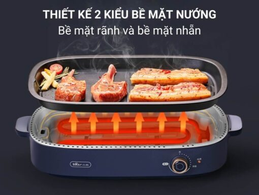 – Thiết kế 2 kiểu bề mặt nướng: bề mặt rãnh và bề mặt nhẵn, phù hợp để nướng nhiều loại thịt, hải sản khác nhau.