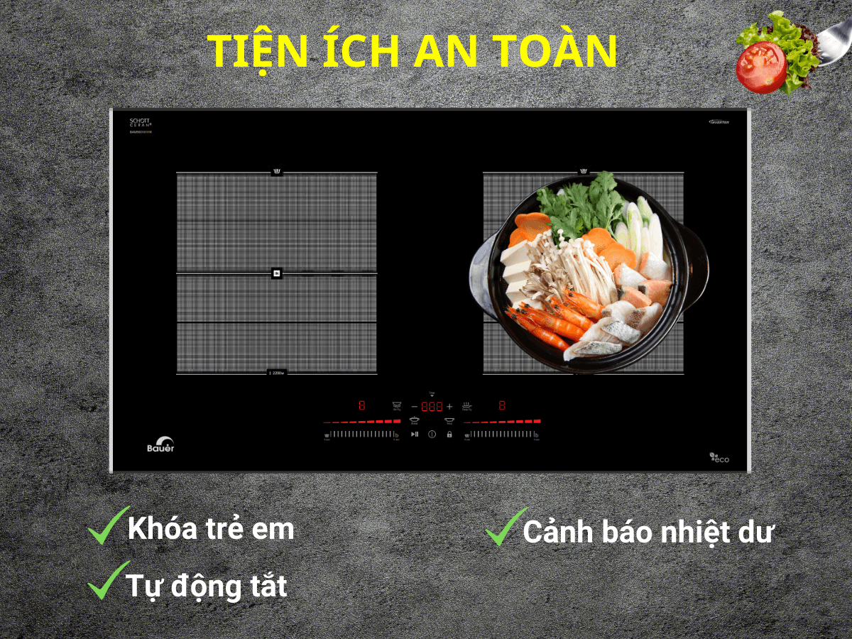 Khoá an toàn trẻ em là một tính năng quan trọng trên bếp từ để đảm bảo an toàn trong quá trình nấu nướng. Tính năng này sẽ làm khoá bảng điều khiển bếp, giúp ngăn trẻ em vô tình điều khiển bếp từ, tránh các sự cố ngoài ý muốn.