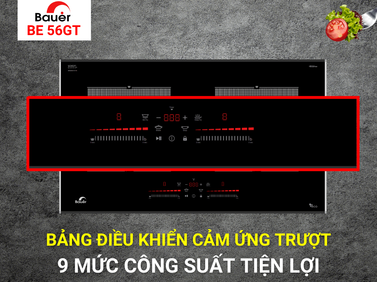Bếp từ BAUER BE 56GT được trang bị điều khiển cảm ứng trượt slide, giúp bạn dễ dàng điều chỉnh và kiểm soát nhiệt độ nấu nướng. Điều này tạo ra trải nghiệm sử dụng thuận tiện và linh hoạt. Thay vì chạm từng nấc để điều chỉnh tăng giảm mức nhiệt, với cảm ứng trượt, bạn chỉ cần vuốt ngón tay trên bề mặt điều khiển, tương tự như việc sử dụng một điện thoại thông minh hoặc máy tính bảng.