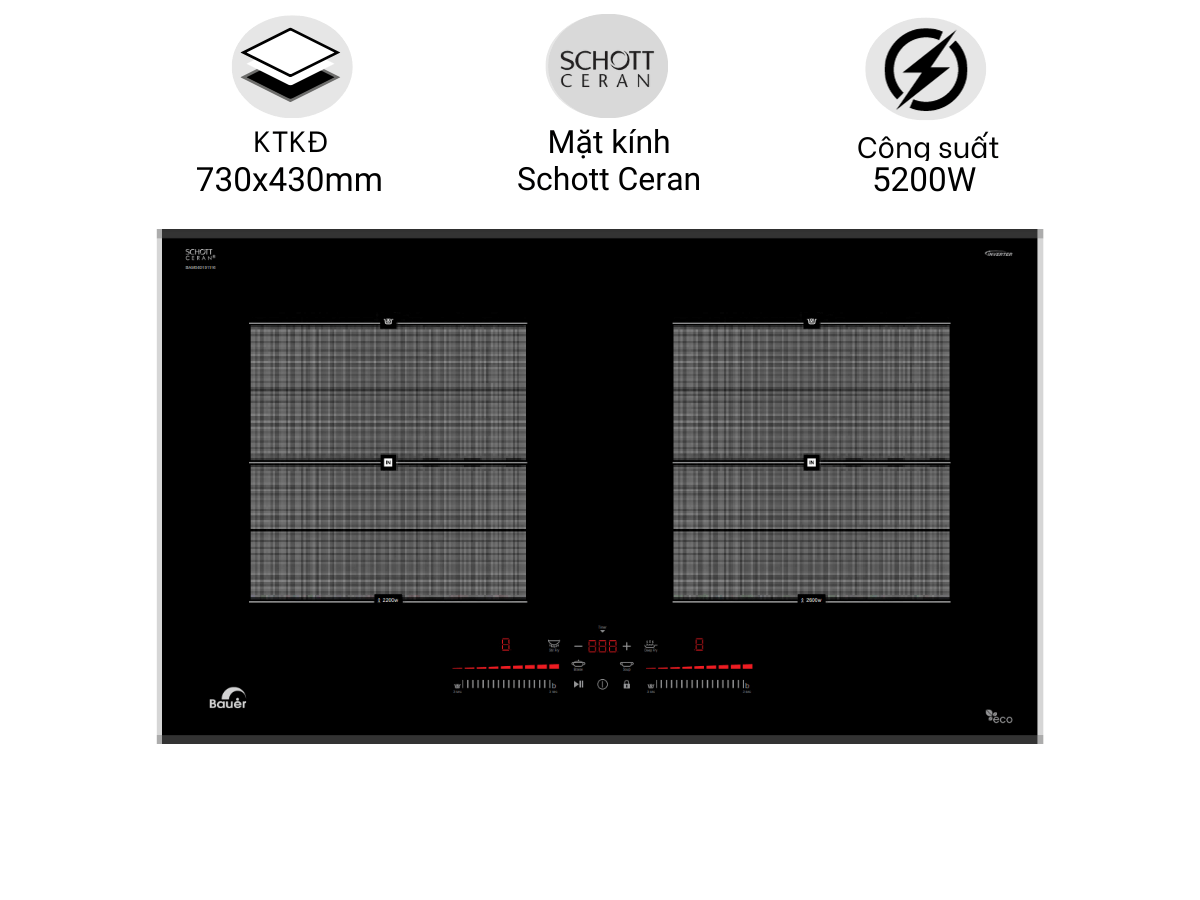 Bếp được thiết kế với 2 vùng nấu tổng công suất 5,2kW, công suất mỗi vùng nầu 2.2kW và gia nhiệt nhanh đạt 2.6kW. Với 2 vùng nấu cùng công suất lớn, bếp từ Bếp từ Bauer BE 56GT đem đến khả năng nấu nướng nhanh chóng, tiện lợi, tiết kiệm thời gian cho người nội trợ.