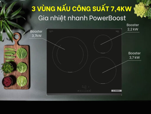 Bếp từ Bosch PIJ631BB5E có 3 vùng nấu tổng công suất 7400W giúp nấu nướng nhanh chóng, tiết kiệm thời gian. Mặt kính Schott Ceran bền bỉ, chịu nhiệt và kháng sốc nhiệt tốt, vát nghiêng cạnh trước tăng thêm vẻ thẩm mỹ, tinh tế. Chức năng PowerBoost gia nhiệt nhanh giúp rút ngắn thời gian nấu đến 50%.
