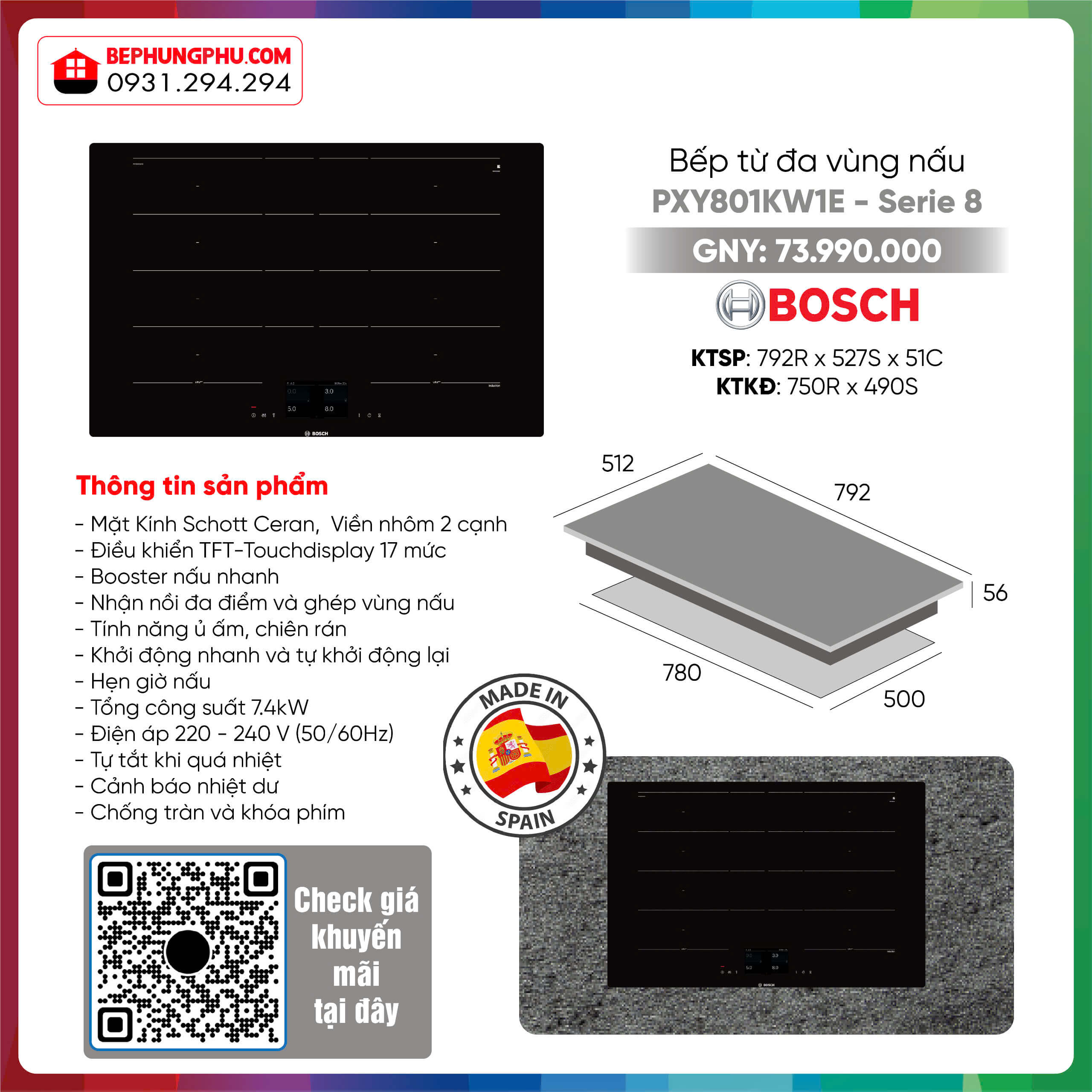 Ðặc biệt khi mua bếp từ Bosch PXY801KW1E tại showroom Siêu Thị Bếp Hưng Phú quý khách có thể nhận ưu đãi chiết khấu đến 20%.