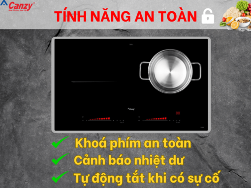 Bếp từ Canzy CZ 702IP có hệ thống cảm biến hiện đại dưới mỗi vùng nấu, có thể phát hiện các sự cố như có nước hoặc thức ăn tràn xuống bảng điều khiển, nồi bị cháy hoặc bị cạn nước, hay bếp bị quá nhiệt, quá áp, hoặc không có nồi đặt trên bếp. Trong những trường hợp này, bếp sẽ tự động ngắt công suất để đảm bảo an toàn cho bếp, an toàn của người dùng cũng như tránh lãng phí điện năng.