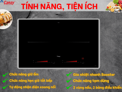 Bếp từ Canzy CZ 702IP có 2 vùng nấu với công suất mỗi vùng 2300W. Trong đó vùng nấu bên trái được trang bị tính năng gia nhiệt nhanh Booster, có thể đẩy công suất từ 2300W lên đến 3000W. Do đó trong những trường hợp cần nấu nhanh, đun nước hay nấu những món đòi hỏi nhiệt độ cao, thì bạn có thể kích hoạt Booster cho vùng nấu trái để đẩy nhanh tiến độ nấu nướng.