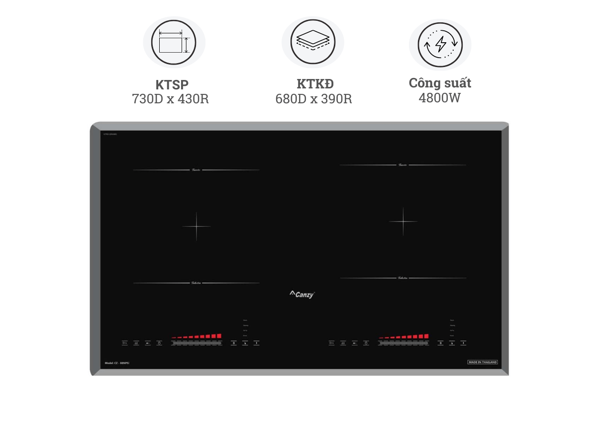 Bếp được thiết kế với 2 vùng nấu tổng công suất 4000W. Mỗi vùng nấu có công suất 2000W – Booster 2400W. Với 2 vùng nấu cùng công suất lớn, bếp từ Canzy CZ 88NPSI đem đến khả năng nấu nướng nhanh chóng, tiện lợi, tiết kiệm thời gian cho người nội trợ.