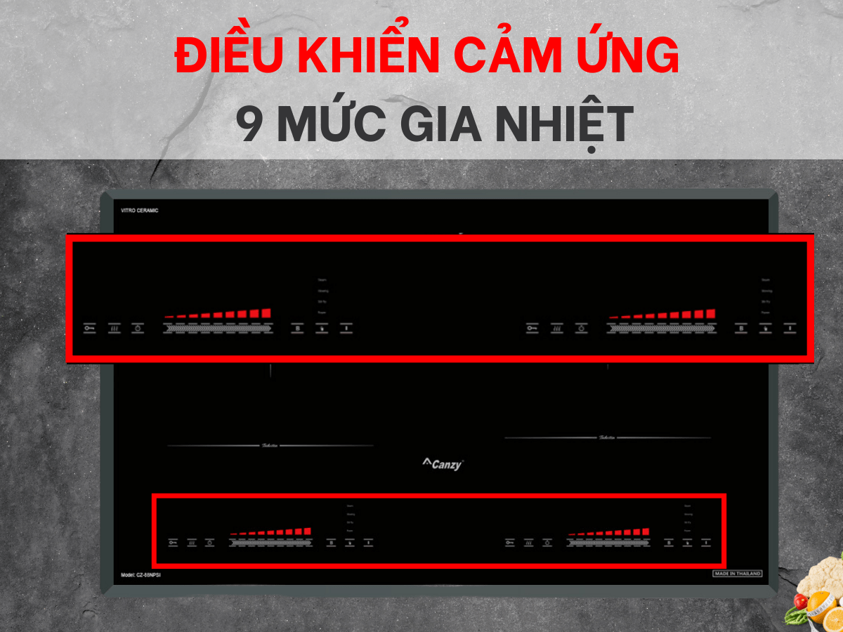 Bếp từ Canzy CZ 88NPSI được trang bị 9 mức gia nhiệt, gồm 8 mức cơ bản và 1 mức tăng cường Booster. Nhiệt độ được chia nhỏ thành 9 mức giúp bạn dễ dàng điều chỉnh và lựa chọn mức nhiệt phù hợp nhất với món ăn của mình. Từ những món đơn giản đến phức tạp đòi hỏi nhiệt độ chính xác, từ món cần mức nhiệt thấp đến món đòi hỏi mức nhiệt cao, bạn đều có thể dễ dàng chinh phục.