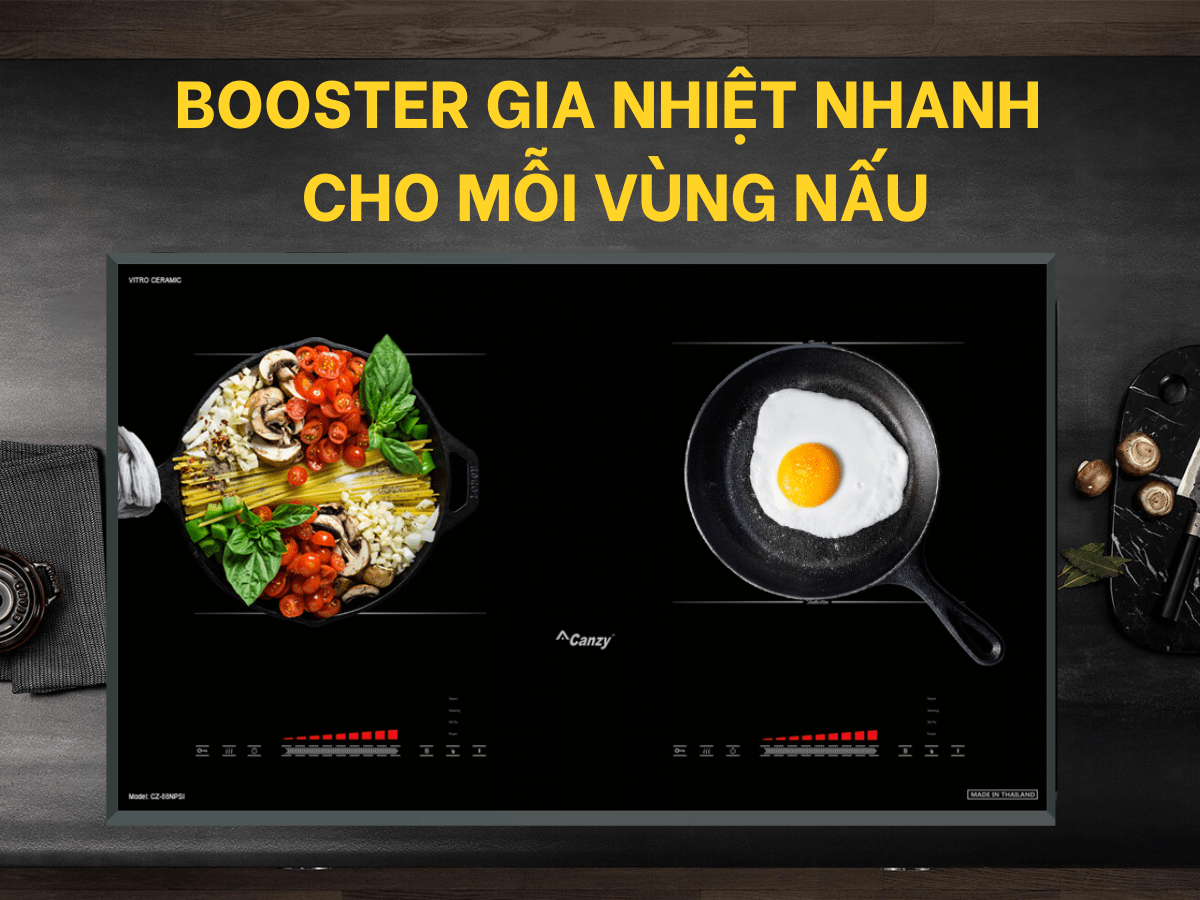 Tính năng gia nhiệt nhanh Booster trên Bếp từ Canzy CZ 88NPSI được kích hoạt bằng cách chạm nhẹ vào nút chữ “B”. Vùng nấu được kích hoạt Booster sẽ được đẩy công suất từ 2000W lên 2400W một cách nhanh chóng mà không mất nhiều thời gian chờ đợi để bếp nóng lên từ từ. Booster sẽ giúp đẩy nhanh tiến độ nấu nướng, tiết kiệm thời gian, đặc biệt phù hợp để đun nước hay nấu các món cần mức nhiệt cao.