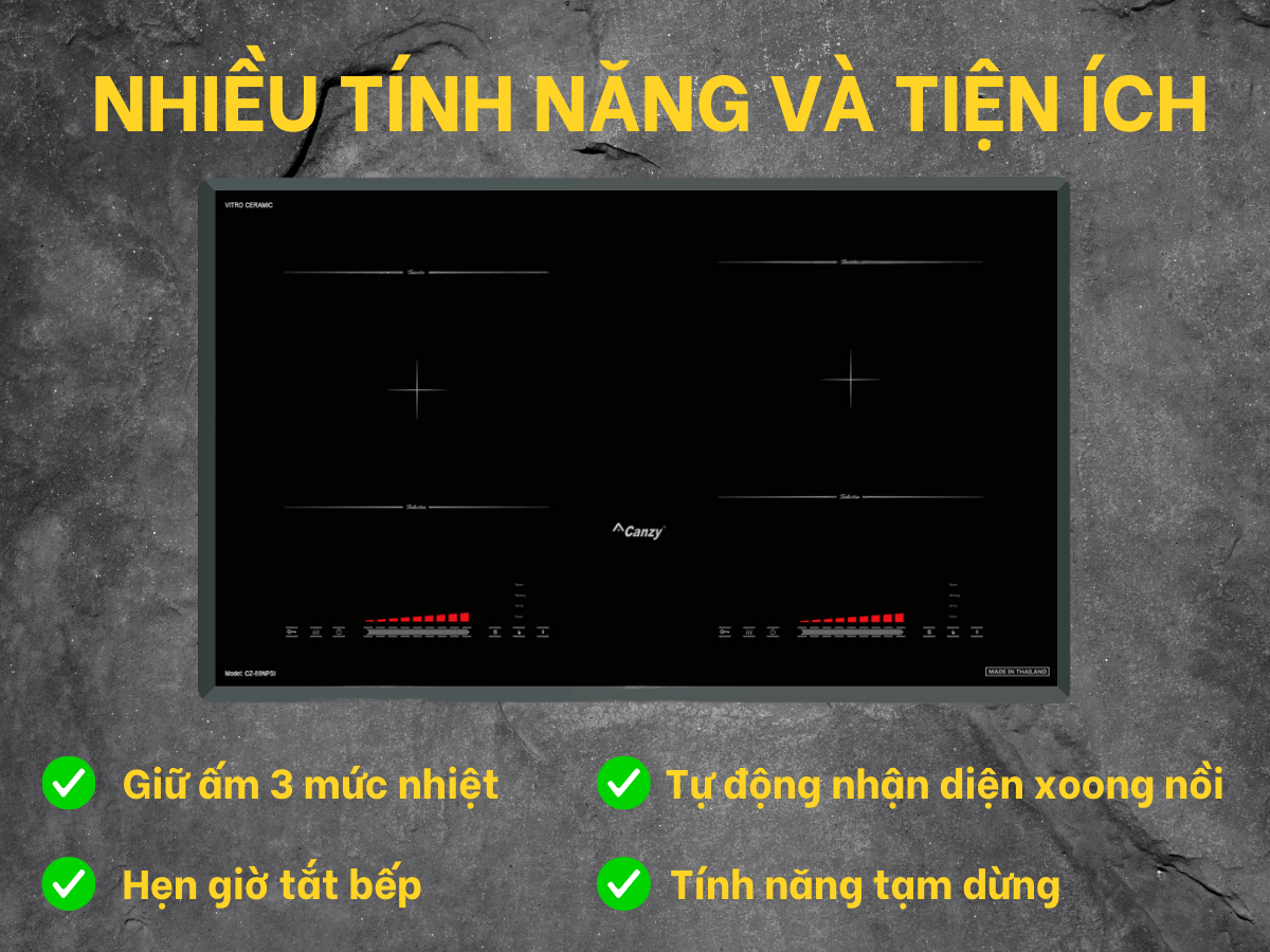 Bếp từ Canzy này còn có khả năng tự động nhận diện loại nồi, kích thước cũng như vị trí đặt nồi. Cảm biến thông minh giúp bếp xác định được loại nồi nấu có phù hợp hay không, nếu không phù hợp sẽ phát cảnh báo để người dùng biết. Và khi dùng đúng loại nồi, bếp cũng sẽ tập trung gia nhiệt đến đúng vị trí mặt bếp được đặt nồi. Nhờ đó hạn chế tối đa nhiệt lượng toả ra xung quanh, giúp món ăn nhanh chín và tiết kiệm điện năng.