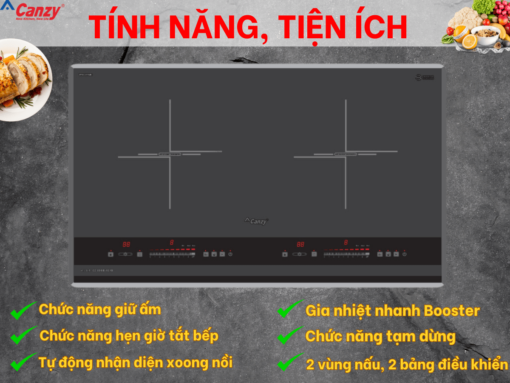 Bếp từ Canzy CZ 898B-62ID thiết kế 2 vùng nấu với bảng điều khiển cảm ứng trượt riêng biệt dễ sử dụng. 2 vùng nấu có tính năng gia nhiệt nhanh giúp nấu nướng nhanh chóng, tiết kiệm thời gian. Ngoài ra bếp được trang bị nhiều tính năng công nghệ hiện đại, tiện ích như: giữ ấm 3 mức nhiệt, cảm biến chiên rán, tính năng sôi đều nhiệt… cho người dùng những trải nghiệm nấu nướng tiện lợi nhất.