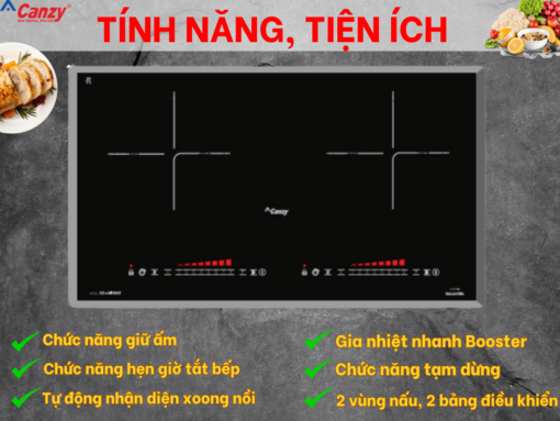 Tính năng gia nhiệt nhanh Booster rất phổ biến trên bếp từ, giúp gia tăng công suất cho vùng nấu lên mức cực đại một cách nhanh chóng. Và trên Bếp từ Canzy CZ MIX82T, tính năng Booster được tích hợp trên cả 2 vùng nấu, có thể đẩy công suất vùng nấu từ 2000W lên 2400W. Nhờ đó giúp nấu chín món ăn nhanh chóng, tiết kiệm thời gian.