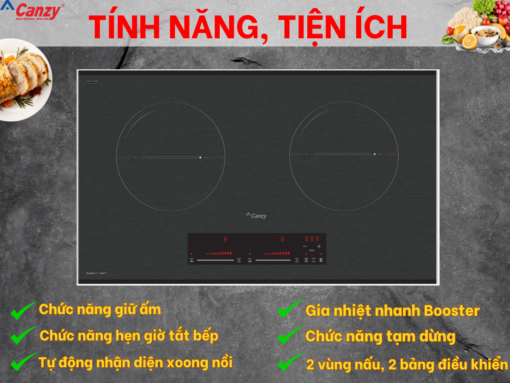 Bếp được thiết kế với 2 vùng nấu tổng công suất 4000W. Mỗi vùng nấu có công suất 2000W và được trang bị chức năng nấu nhanh Booster. Với 2 vùng nấu cùng công suất lớn, bếp từ Canzy CZ TL867T đem đến khả năng nấu nướng nhanh chóng, tiện lợi, tiết kiệm thời gian cho người nội trợ.