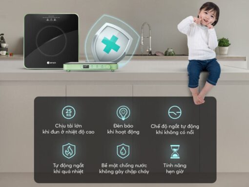 Cùng với đó là thiết kế chân đế chống trượt giúp giữ bếp ổn định trên mặt bàn, đảm bảo an toàn sử dụng. Cùng với quạt đối lưu và khe tản nhiệt lớn giúp hạn chế quá nhiệt khi nấu nướng.