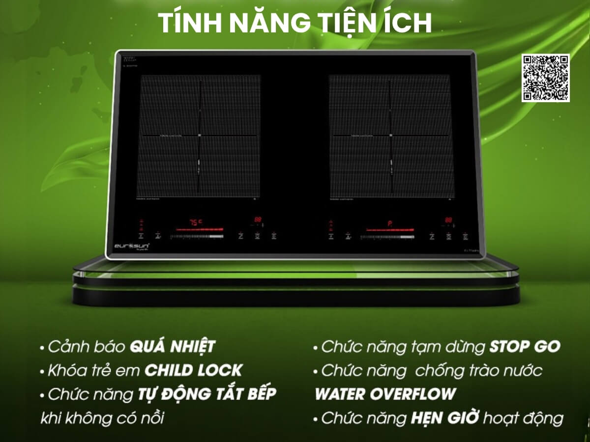 Bếp từ Eurosun EU-T769Pro sở hữu thiết kế 2 vùng nấu sang trọng với mặt kính Euro Platinum cao cấp, chịu nhiệt, chống xước và chống bám vân tay. Với tổng công suất 4200W cùng công nghệ gia nhiệt Booster 3000W mỗi vùng giúp nấu nhanh, các chế độ nhiệt đa dạng cùng nhiều tính năng thông minh như tạm dừng Stop & Go, chống trào nước và khóa trẻ em mang đến trải nghiệm nấu nướng tiện lợi và an toàn.