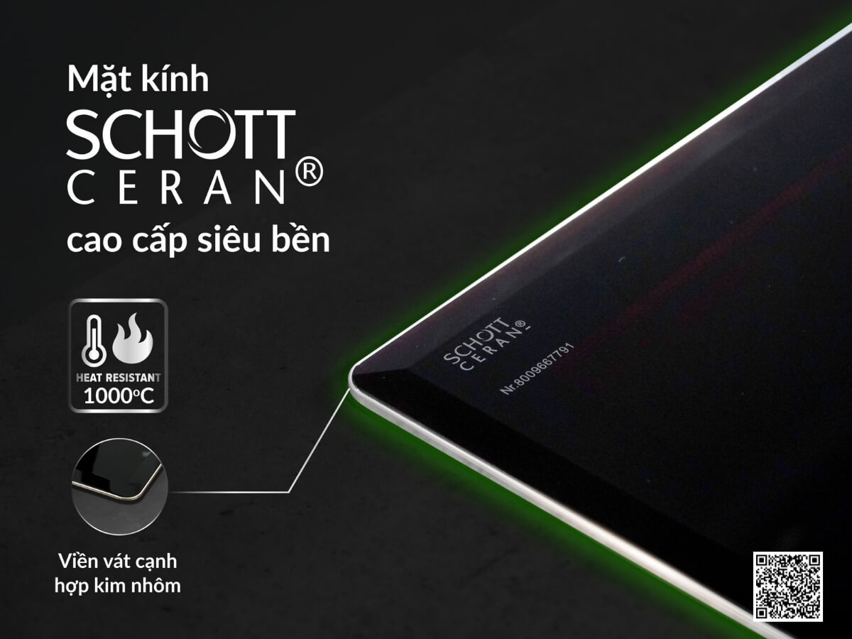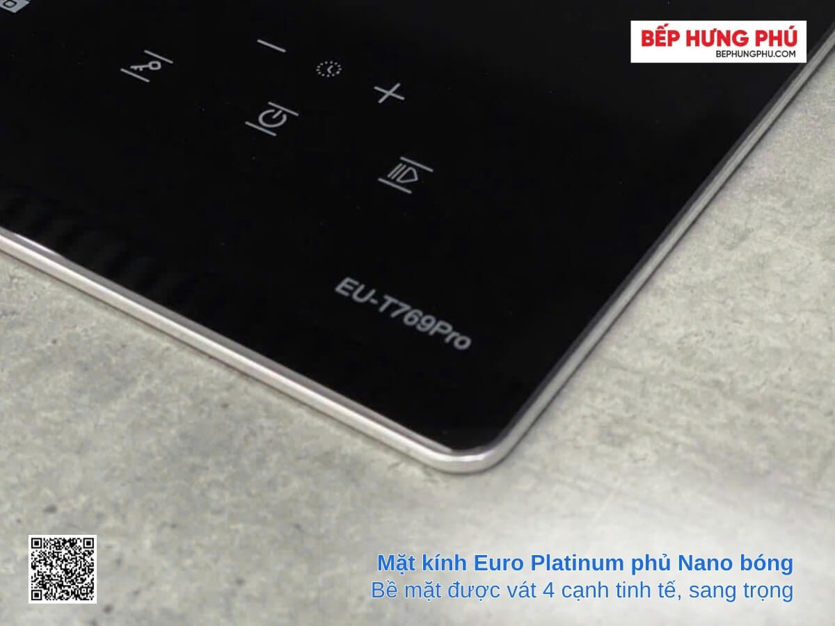 Bếp từ Eurosun EU-T769Pro được trang bị mặt kính Euro Platinum (Schott Ceran) phủ Nano bóng, có khả năng chống trầy xước, chống bám vân tay và chịu nhiệt, chịu lực cực tốt. Bề mặt được vát 4 cạnh tinh tế, tạo cảm giác sang trọng và dễ dàng vệ sinh sau mỗi lần sử dụng. Lớp phủ Nano không chỉ giúp bếp luôn sáng bóng mà còn hạn chế bám dầu mỡ, giữ cho gian bếp luôn sạch sẽ, gọn gàng. Mặt kính cao cấp này cũng giúp tản nhiệt nhanh, bảo vệ các linh kiện bên trong và kéo dài tuổi thọ sản phẩm.